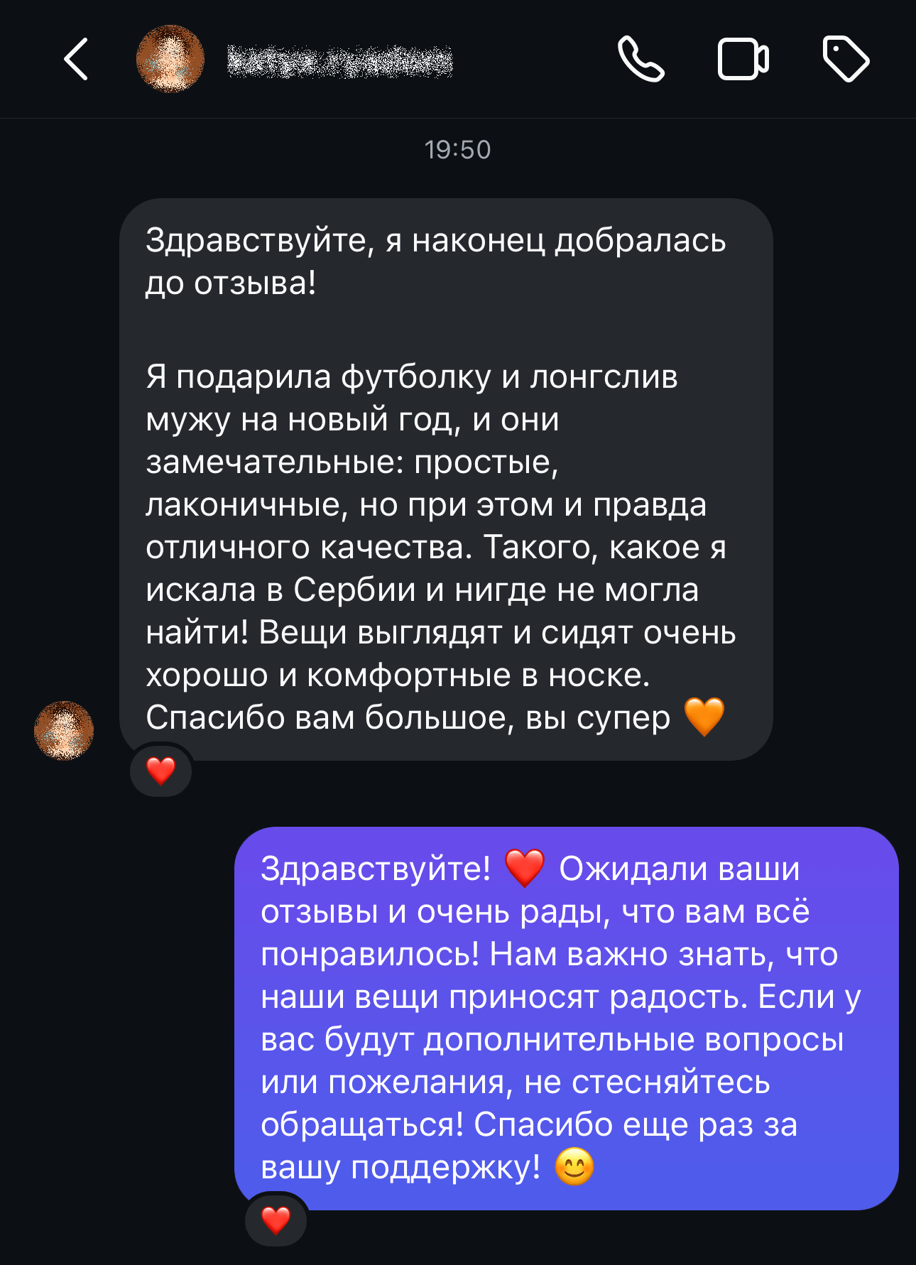 Здравствуйте, я наконец добралась до отзыва! Я подарила футболку и лонгслив мужу на новый год, и они замечательные: простые, лаконичные, но при этом и правда отличного качества. Такого, какое я искала в Сербии и нигде не могла найти! Вещи выглядят и сидят очень хорошо и комфортные в носке. Спасибо вам большое, вы супер ❤️