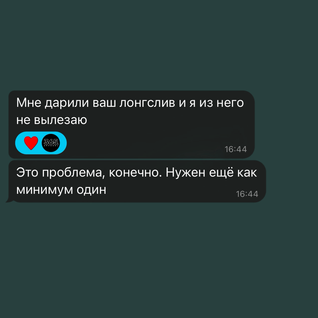 Мне дарили ваш лонгслив и я из него не вылезаю. Это проблема, конечно. Нужен ещё как минимум один.